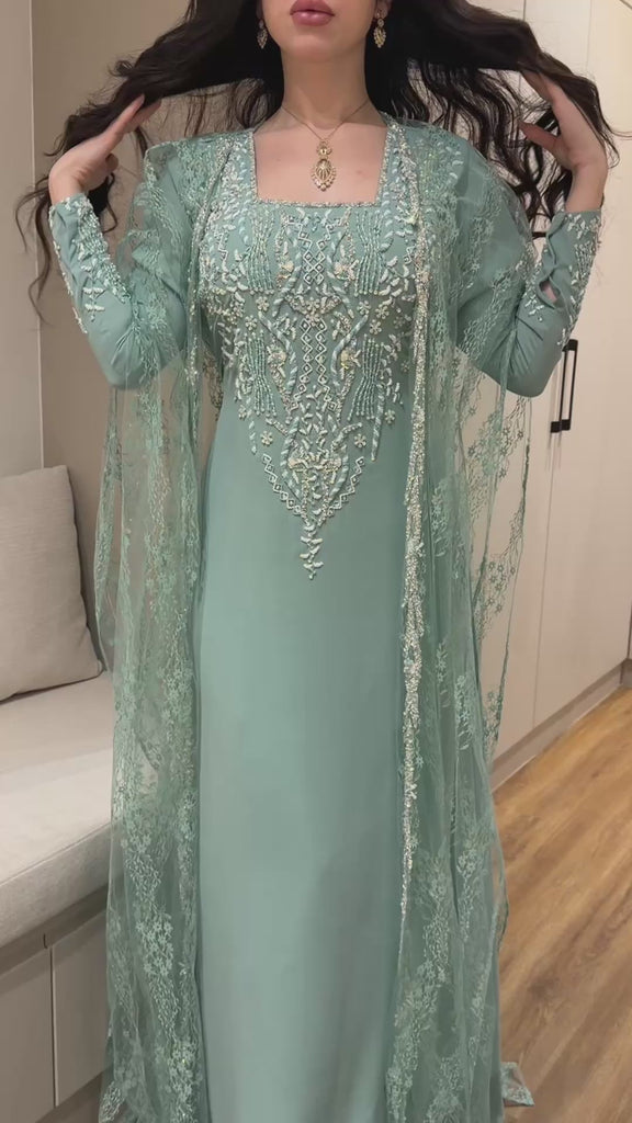 جلابية بلون تيفاني الساحر تعكس لمعة راقية وهدوء أنثوي من أول نظرة.