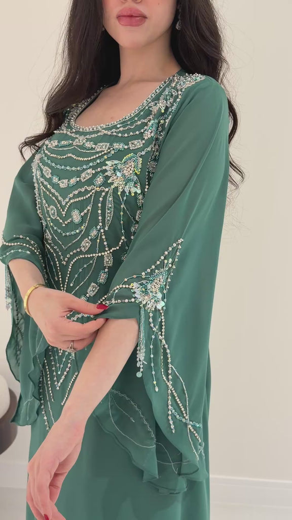 مزدانة بشكّ يدوي فاخر من الخرز والكريستالات بتدرجات لامعة تنسدل بانسيابية راقية على القماش.